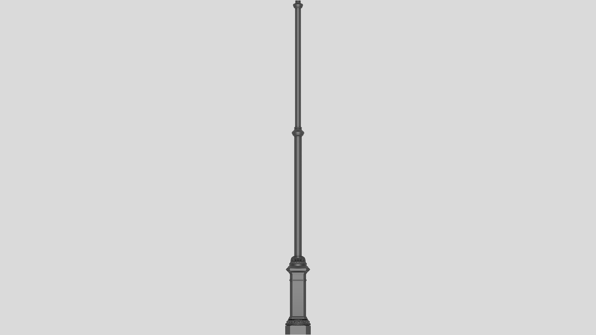 Base with central body with inspection hatch and octagonal section balustrade decorated with floral, ovule and rosette decorations with steel pipe section decorated with leaves. Castore – made of steel, cast iron top with floral decorated bracket suitable for suspended luminaires
