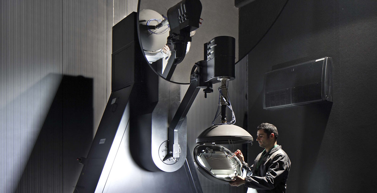 It’s a performance test on light fixtures and light sources. A mirror goniophotometer is used to determine performance, light output (LOR [%]), efficacy (η [lm / W]) and luminous intensity distribution in accordance with EN 13032-1 and UNI 11365. The room where the test equipment is located is air conditioned with constant temperature, humidity and air speed.